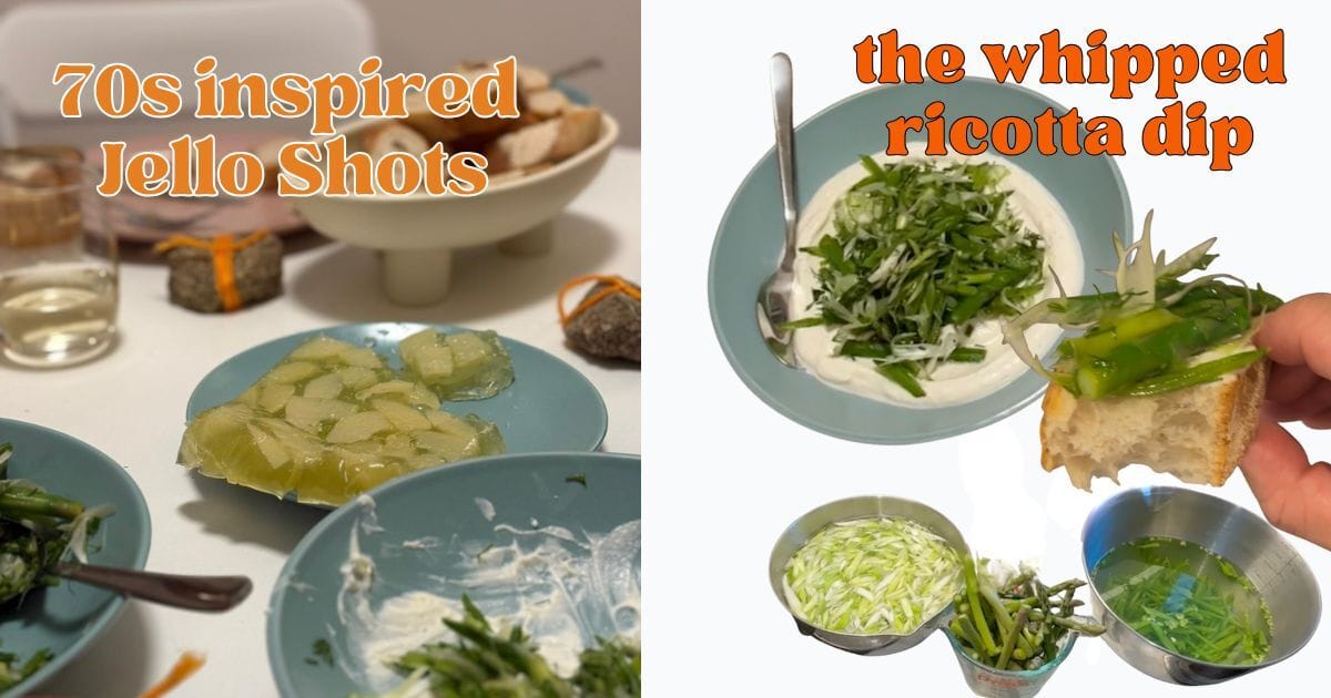 A lovely spring-ish dip: technically a whipped ricotta with spring vegetables. Paired with really good bread, it's the perfect refresher. Chips and dip were the iconic casual, cocktail-style entertaining staple of that decade—that, plus the introduction of television in living rooms. I mean, that's a solid weekend den setup right there.