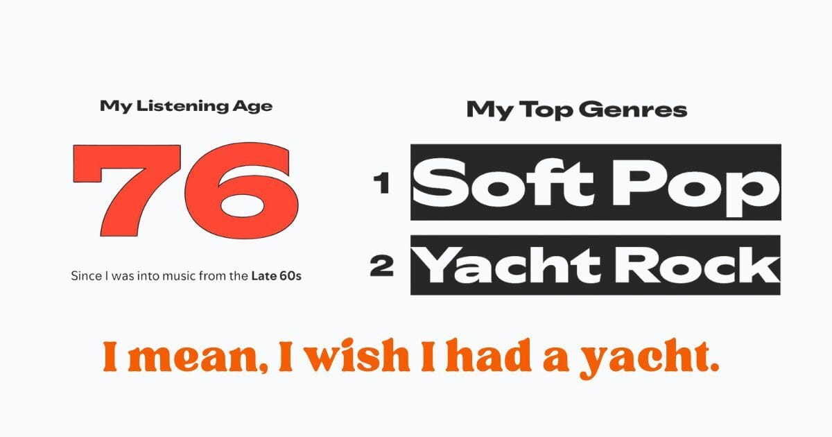 The first inspiration: There's such anticipatory buzz in those few days in December when everyone decides to share their Spotify Wrapped. I was equally anxious when mine dropped, and imagine my surprise when I saw my Spotify Listening Age: 76.